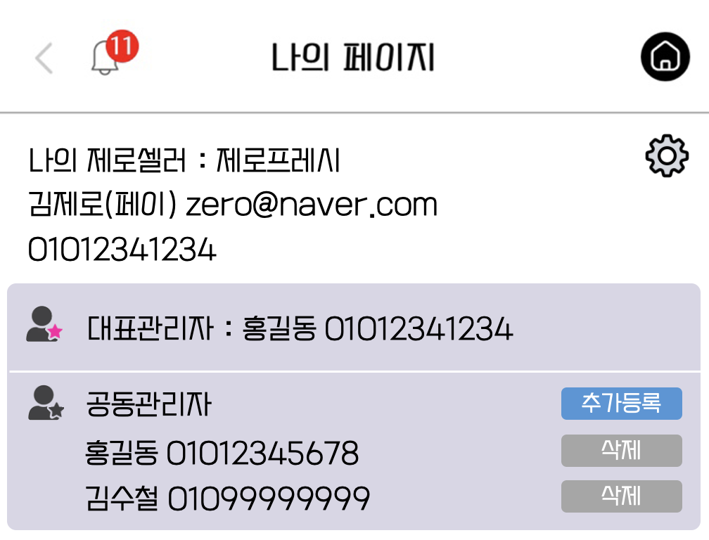 제로마트 판매자 승인이 완료되면 대표자 계정에서 공동관리자를 직접 추가등록 및 삭제를 하실 수 있습니다.