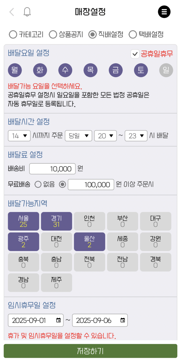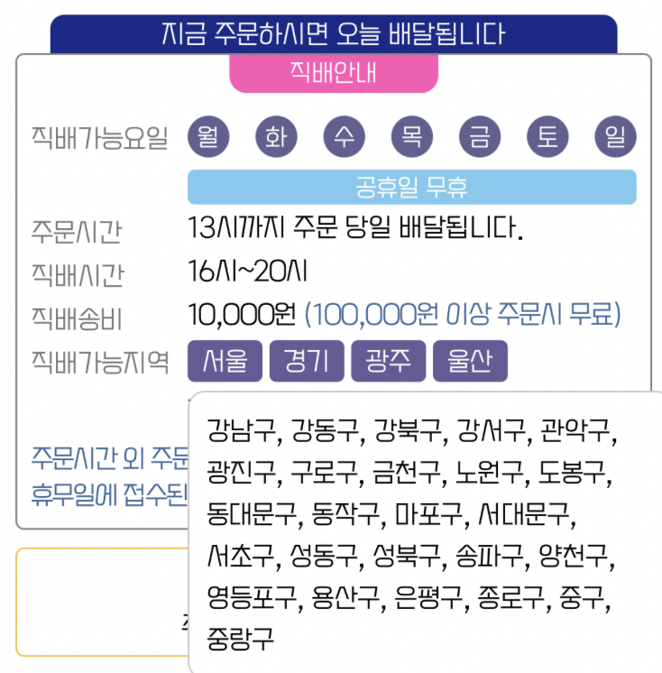 배달가능지역은 구단위까지 설정이 가능합니다. 직배 가능한 지역을 지역별로 선택하시면 주문시 동일하게 배달가능 지역 안내가 노출됩니다.