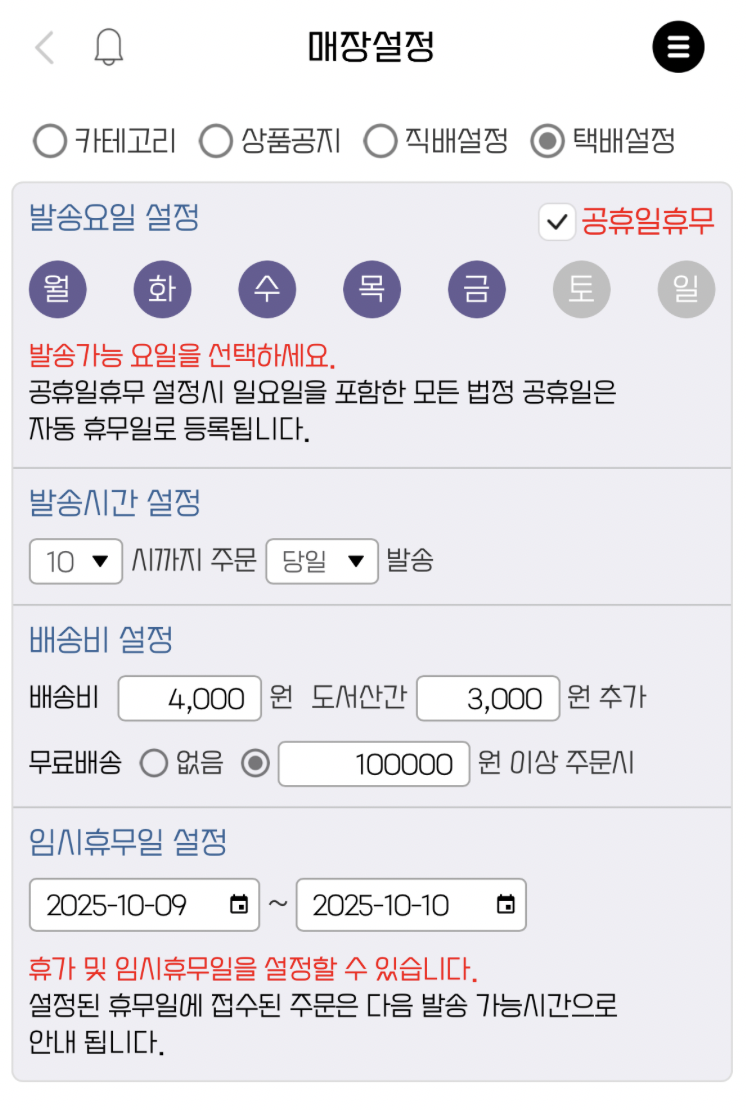 등록된 배달요일에 따라 고객 주문시 배달가능 시간을 안내합니다.