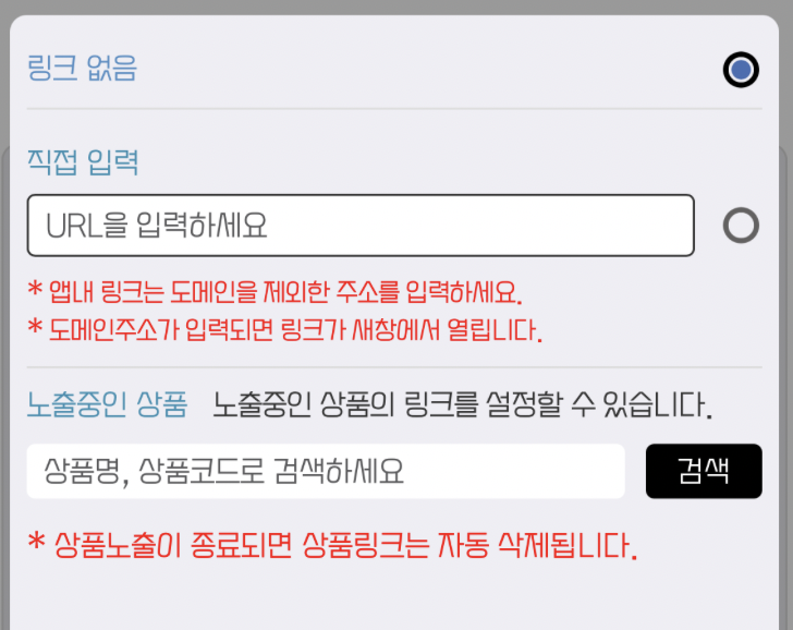 링크걸기를 통해 URL주소를 입력하시거나 노출중인 상품으로 링크를 선택하실수 있습니다.