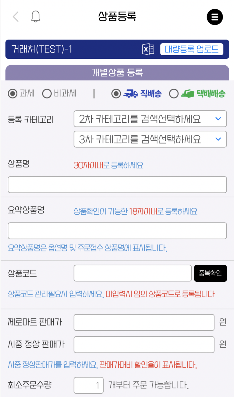 제로셀러에서 상품등록은 개별등록과, 엑셀 대량등록을 지원합니다.