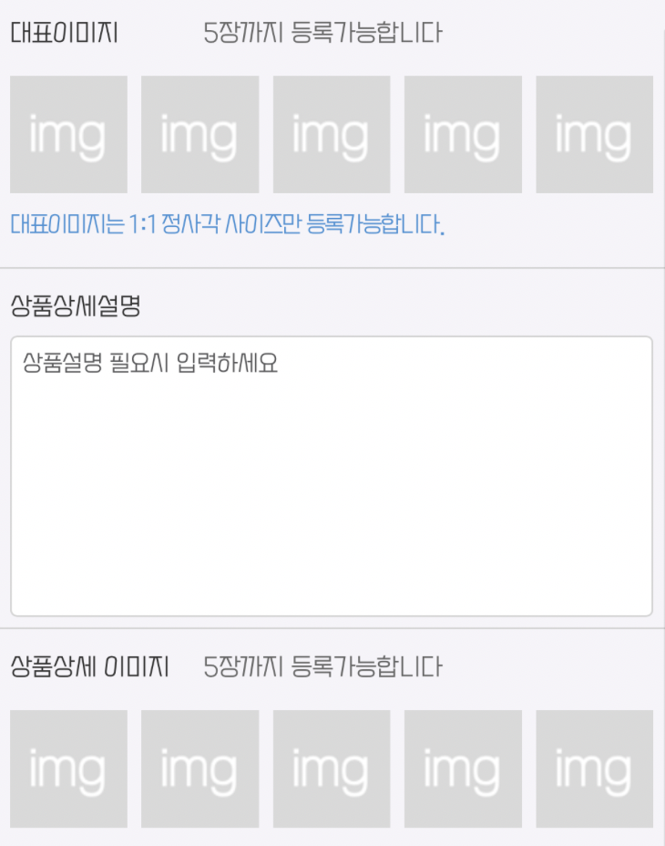 > 대표이미지를 등록하세요. 최대 5장까지 등록 가능하며 첫번째 등록 이미지가 썸네일로 노출됩니다. 등록된 대표이미지는 상품상세정보 팝업시 상단에 슬라이딩으로 노출됩니다.
