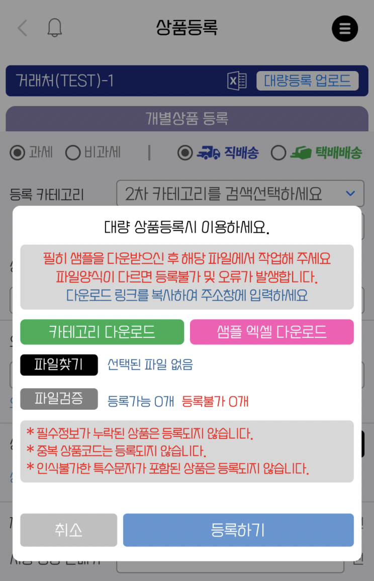 > 파일등록후 검증하기를 하면 등록가능 상품과 등록불가능 상품이 구분되며 등록불가 사유가 안내되어 있음으로 다시 확인 및 수정하여 재등록 하셔야 합니다.