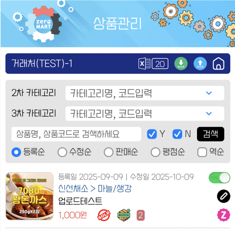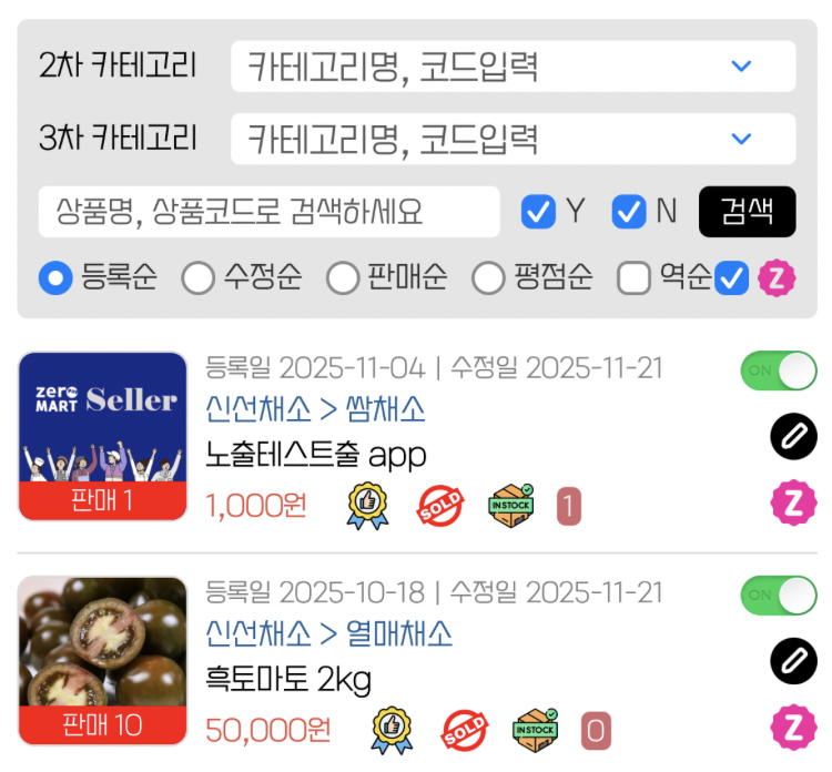 등록된 상품은 제로셀러 메인페이지에서 상품관리로 들어가시면 확인이 가능하며 추가적으로 노출 ON / OFF, 재고 등록, 상품정보 수정 등의 기능이 제공됩니다.