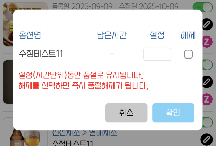 설정에 품절시간을 입력하시면 해당 시간동안 품절로 표시되며 주문이 불가합니다.