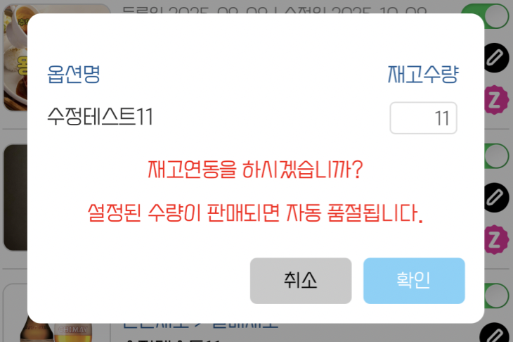 > 품절설정 : 품절 아이콘을 누르시면 품절을 등록할 수 있습니다.