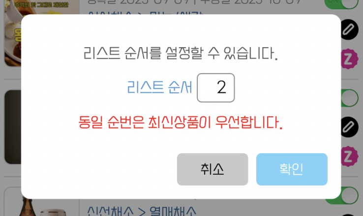 > 상품노출순서 설정 : 숫자표시를 누르면 노출순서를 설정할 수 있습니다.