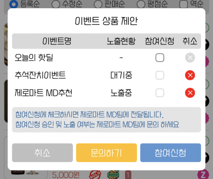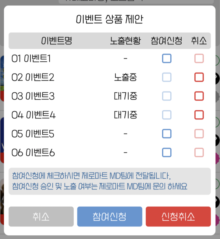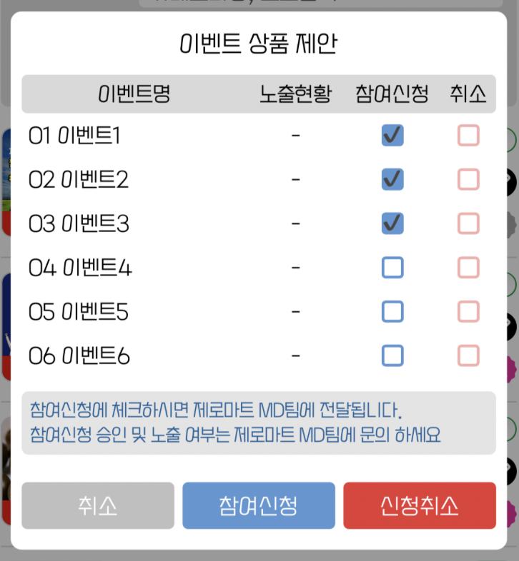 제로마트에서 운영중인 이벤트 목록이 나오며 원하는 이벤트에 체크(파란색 박스)하여 참여신청을 하시면 해당 상품이 제로마트 MD팀에게 전달됩니다.