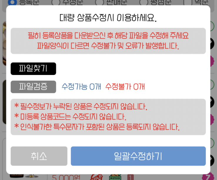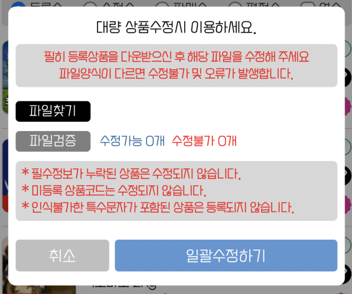 상품정보 양식에 맞게 수정후 등록하시면 일괄수정이 가능합니다.