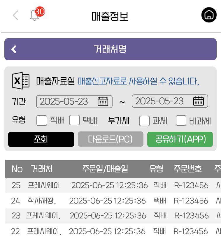 또한 오른쪽 상단의 엑셀아이콘을 누르시면 매출 상세내역으로 세무사 매출신고용 자료로 엑셀 다운로드기능도 제공됩니다.
