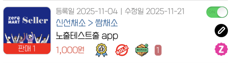 > 노출 설정 : 초록색 ON / OFF 버튼으로 상품의 노출을 ON / OFF하실 수 있습니다. OFF된 상품은 제로마트에서 더이상 노출되지 않습니다. 이벤트에 참여중인 상품이라도 동일적용되니 유의해서 적용바랍니다.