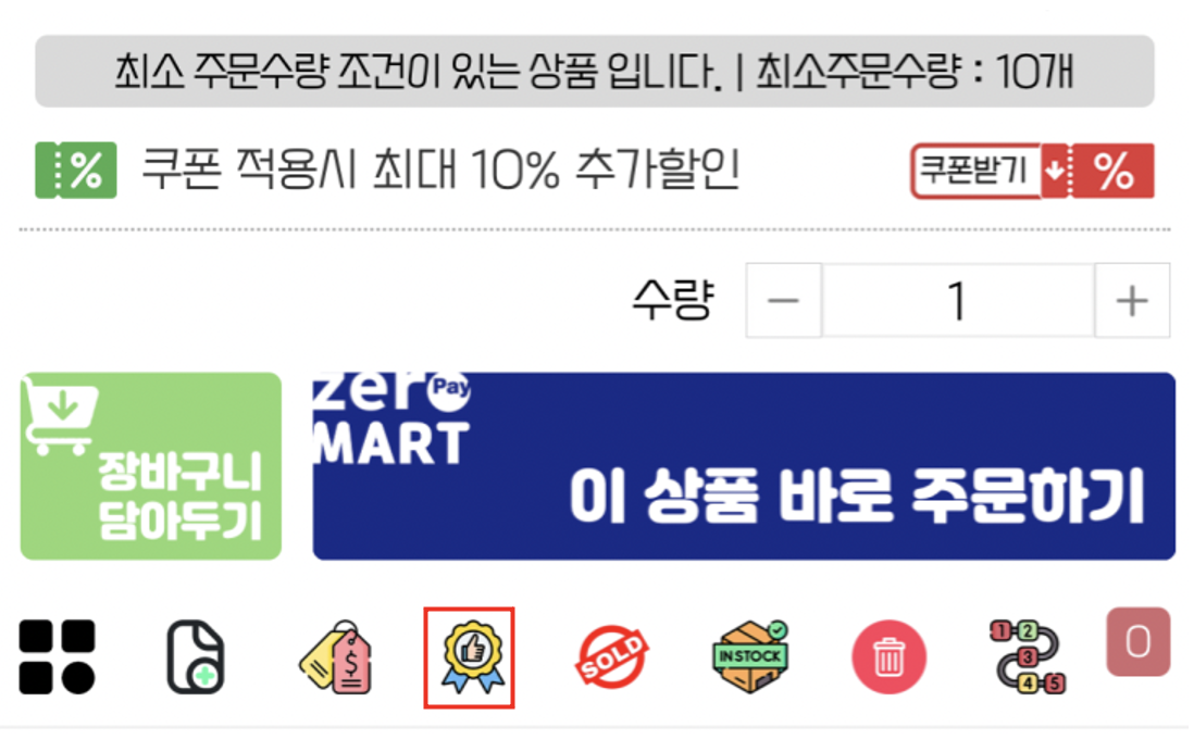 > 최소 주문수량은 입력하세요. 기본값은 1개입니다. 1개 이상 입력시 고객 주문시에는 입력한 수량 이하로는 주문이 불가합니다.